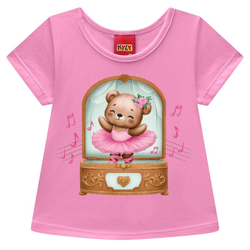 O grande destaque é a estampa localizada com glitter, que traz uma adorável ursinha bailarina dentro de uma caixinha de música, acompanhada por notas musicais que parecem dançar junto. Um design encantador que mistura a magia do balé com a ternura dos bichinhos, tornando o look divertido e cheio de imaginação. Perfeita para compor looks alegres e cheios de charme, essa blusa Kyly é pura doçura e conforto, ideal para dias leves e cheios de fantasia!