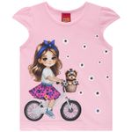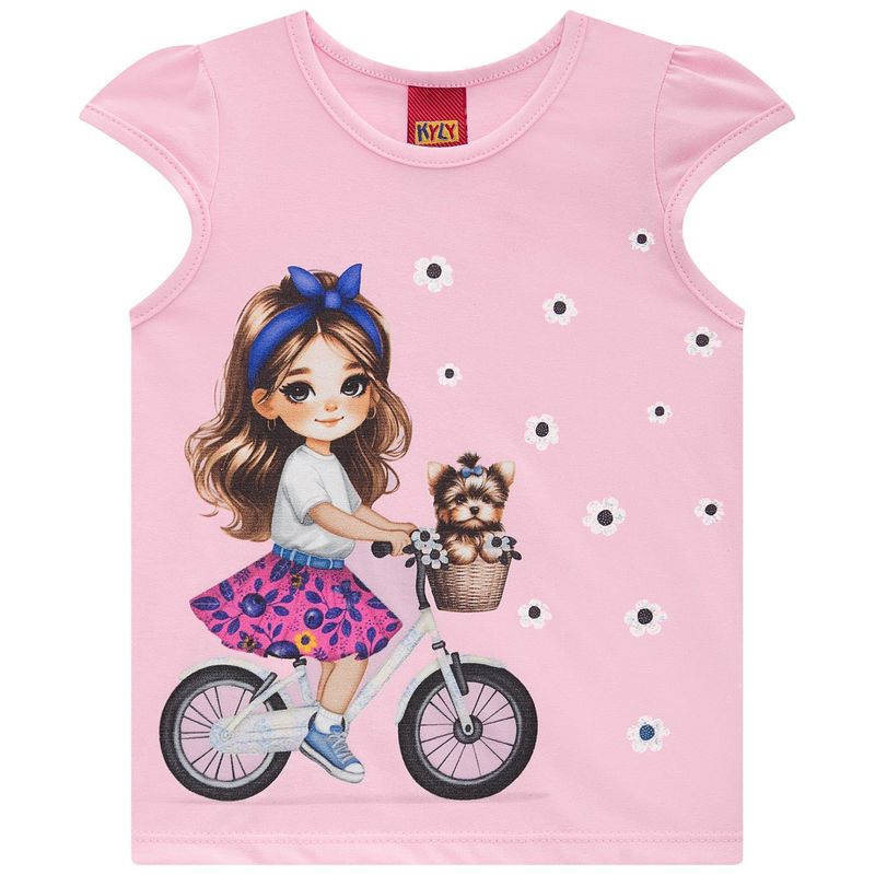 A modelagem tradicional oferece caimento soltinho e confortável, com mangas curtas delicadas e decote redondo que proporcionam praticidade e liberdade de movimento. O destaque fica por conta da estampa encantadora de uma menina pedalando sua bicicleta ao lado de um cachorrinho fofo, acompanhada de flores espalhadas, criando um visual alegre, lúdico e cheio de doçura. Uma peça charmosa e versátil, perfeita para compor looks casuais com saias, shorts ou calças. Um toque de ternura que nunca sai de moda!