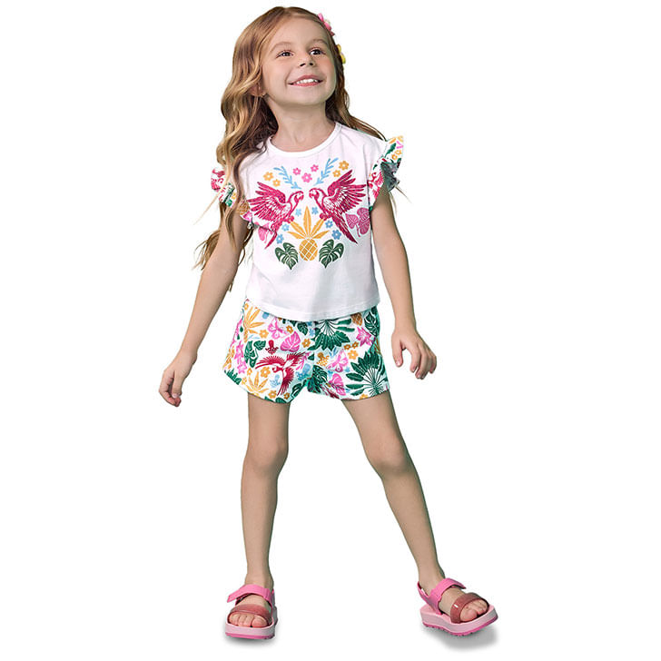 Cheio de cores, alegria e estilo, o Conjunto Infantil Nanai é perfeito para os dias mais quentes! Composto por uma blusa cropped com babadinhos nas mangas e shortinho leve, esse look é a combinação ideal de conforto e diversão para meninas que amam brincar com liberdade e estar sempre bem vestidas. A estampa tropical exclusiva com araras, abacaxis e folhagens tropicais traz um toque moderno e encantador, disponível em duas versões vibrantes: branco com estampa colorida e amarelo com tons terrosos. Ideal para passeios, viagens, festas ao ar livre ou qualquer momento em que o conforto e o estilo sejam prioridade. Combine com sandálias ou tênis casuais para um look completo e divertido! Tamanho 2 ao 3