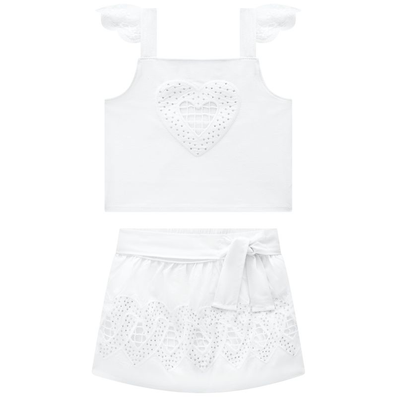 Um look apaixonante para brilhar nas comemorações! O conjunto infantil menina Milon é puro encanto, combinando elegância, conforto e o toque festivo ideal para o Natal e o Ano Novo. A blusa cropped em cotton 95% algodão e 5% elastano, com forro 100% algodão, apresenta uma modelagem moderna e confortável, com alças delicadas e um bordado de coração aplicado ao centro, enriquecido por brilhos em strass que trazem um toque de sofisticação e charme.