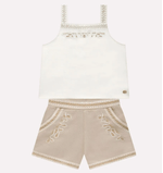 O short, no mesmo tecido de linho, possui bordados nas laterais que harmonizam com o cropped, criando um visual elegante e encantador. Sua modelagem soltinha e o forro interno em poliéster e algodão proporcionam conforto e liberdade para brincar, passear e se divertir com leveza. Um conjunto perfeito para ocasiões especiais ou para os dias de verão que pedem um toque de delicadeza e estilo!
