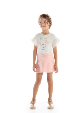 Um look moderno e cheio de charme para meninas estilosas! Este conjunto feminino infantil é composto por uma blusa off-white com estampa divertida e detalhes em relevo, além de mangas curtas com babados em tule que acrescentam leveza e delicadeza ao visual. Acompanha uma saia rosa em tecido canelado, com bolsos frontais e cintura elástica para maior conforto. Ideal para passeios, aniversários e momentos especiais!