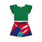 Conjunto para menina composto por blusa em meia malha e short em sarja com elastano. A blusa possui mangas curtas e lisa. O short conta com elástico na cintura e uma estampas super linda.