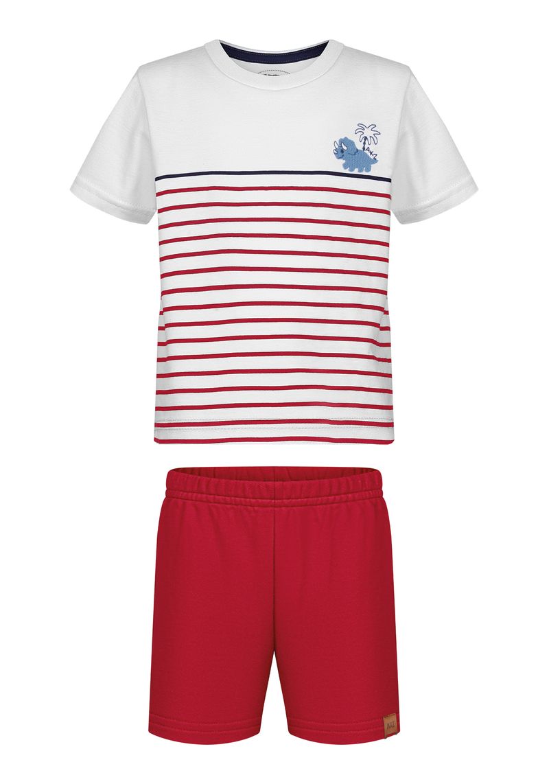 A estampa do pequeno dinossauro confere um toque divertido, aventureiro e imaginativo à peça. Para a criança, é um convite para a brincadeira e a fantasia. Ao invés de uma estampa grande e chamativa, o dinossauro é um detalhe pequeno e discreto, garantindo que o tema esteja presente sem ser excessivamente infantilizado. Uma roupa que é tão confortável para engatinhar ou correr no parquinho quanto arrumada o suficiente para um passeio em família.