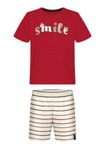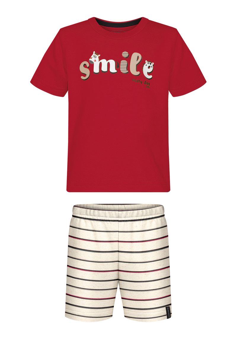 Este conjunto se destaca pelo uso de cores mais quentes e terrosas, e por uma temática focada em atitude e diversão. Focado em mensagens curtas ("smile") e na presença de pequenos mascotes/personagens, o conjunto se alinha a tendências da moda mini-me (adaptações da moda adulta para crianças). Usa cores da moda e o clássico padrão de listras finas para criar um visual que é ao mesmo tempo super confortável para o dia a dia e visualmente trendy. É um conjunto ideal para o verão e meia-estação. Tamanho 1.