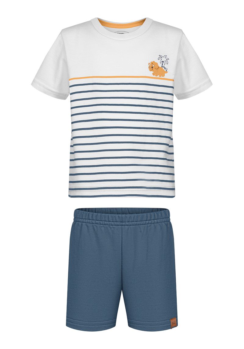 A estampa do pequeno dinossauro confere um toque divertido, aventureiro e imaginativo à peça. Para a criança, é um convite para a brincadeira e a fantasia. Ao invés de uma estampa grande e chamativa, o dinossauro é um detalhe pequeno e discreto, garantindo que o tema esteja presente sem ser excessivamente infantilizado. Uma roupa que é tão confortável para engatinhar ou correr no parquinho quanto arrumada o suficiente para um passeio em família.