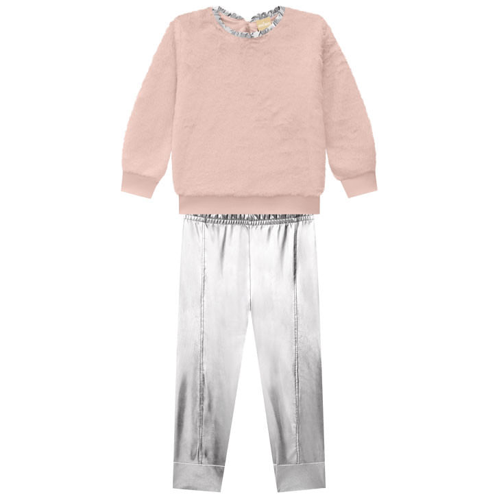 Conjunto Juvenil feminino possui um casaco em pelo liso e legging em malha metalizada.