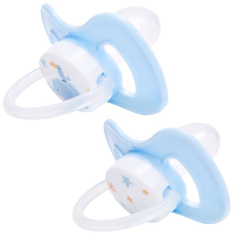 Este kit contém 2 chupetas tamanho 1 (0 a 6 meses) na delicada cor azul com estampa de elefantinho e estrelas.