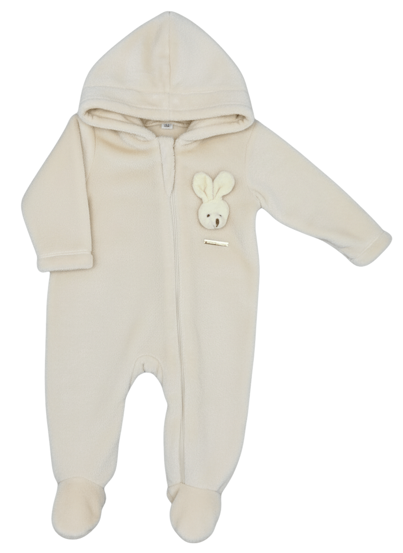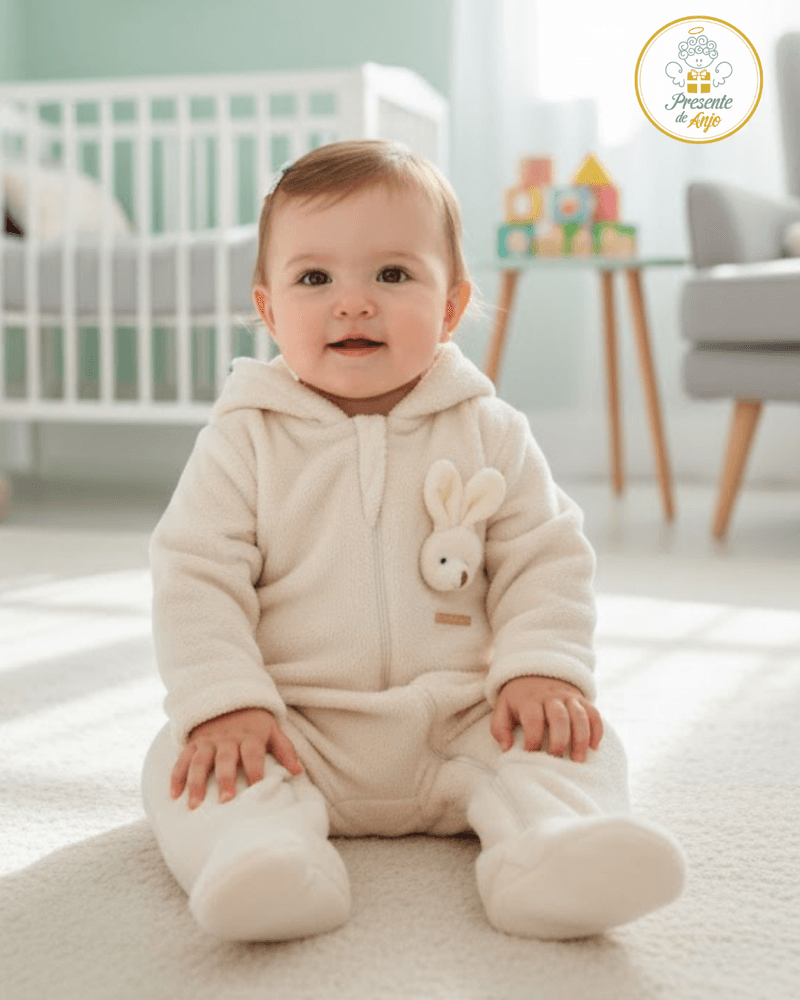 Possui capuz e aplicação delicada de coelhinho no peito, trazendo um visual fofo e elegante. O fechamento frontal com zíper facilita a troca de roupas, tornando o dia a dia dos pais muito mais prático.