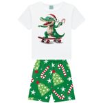 Um Natal divertido e cheio de estilo! O pijama infantil menino Kyly é confeccionado em meia malha 100% algodão, oferecendo conforto, maciez e leveza para noites tranquilas e cheias de imaginação. A camiseta possui modelagem tradicional, com mangas curtas e decote arredondado com acabamento em ribana canelada, garantindo praticidade e caimento perfeito. A estampa localizada é o grande destaque — um jacaré superanimado de gorro natalino, sobre um skate e segurando um doce — com efeito glow in the dark (brilha no escuro) que traz um toque mágico à hora de dormir.