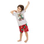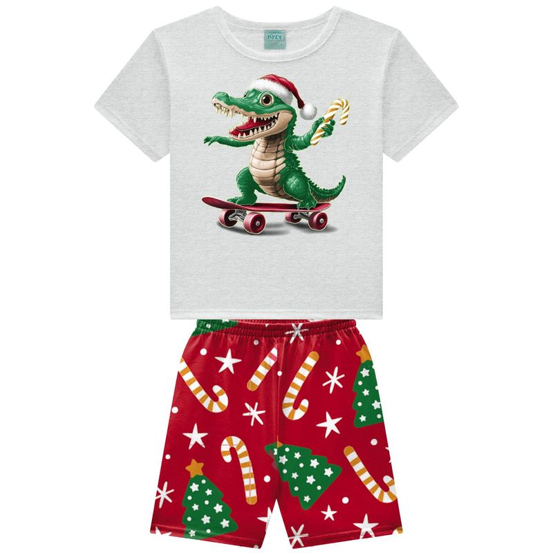 Um Natal divertido e cheio de estilo! O pijama infantil menino Kyly é confeccionado em meia malha 100% algodão, oferecendo conforto, maciez e leveza para noites tranquilas e cheias de imaginação. A camiseta possui modelagem tradicional, com mangas curtas e decote arredondado com acabamento em ribana canelada, garantindo praticidade e caimento perfeito. A estampa localizada é o grande destaque — um jacaré superanimado de gorro natalino, sobre um skate e segurando um doce — com efeito glow in the dark (brilha no escuro) que traz um toque mágico à hora de dormir.
