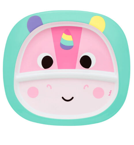 Prato com Divisórias para bebê Bubazoo da Buba, uma solução para as fases de desenvolvimento da sua criança. Possui divisórias para diferentes alimentos e laterais que ajudam o bebê a comer sozinho. Com linda estampa de unicórnio e design lúdico, vai tornar a refeição mais divertida!