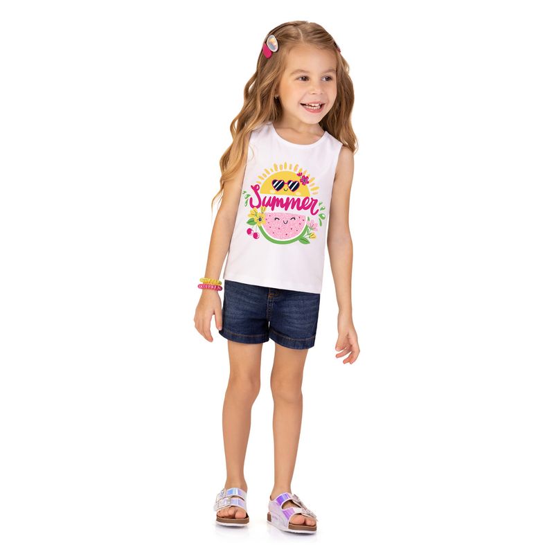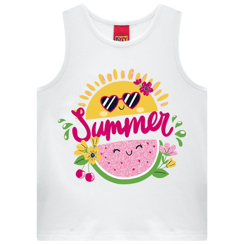 Uma explosão de alegria para os dias ensolarados! A regata infantil menina Kyly é feita para quem ama o verão e não abre mão do conforto. Confeccionada em cotton 100% algodão, o tecido é leve, macio e respirável, proporcionando frescor e liberdade para brincar com muito estilo.