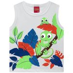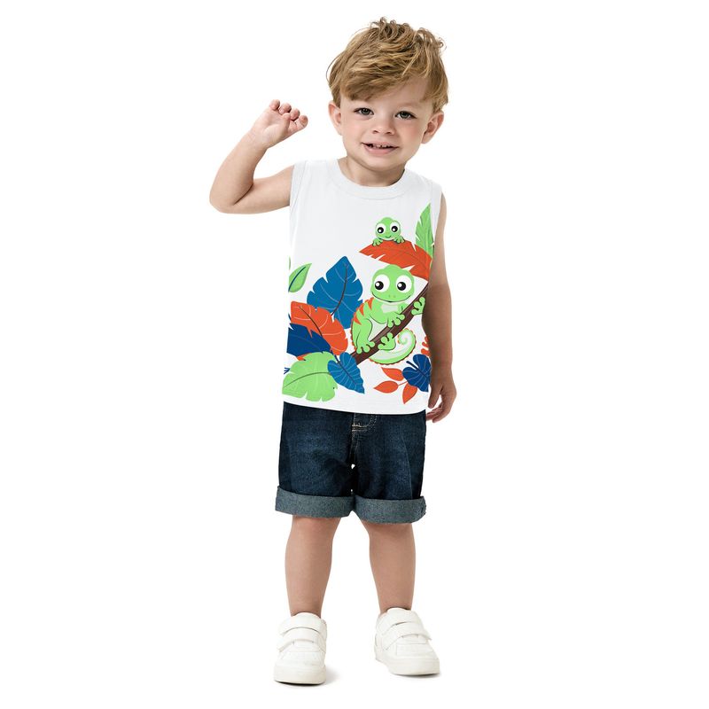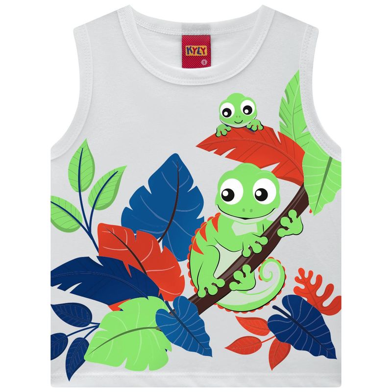 A estampa localizada dos camaleões simpáticos entre folhas coloridas traz um toque de alegria e imaginação, misturando tons vibrantes de verde, azul e laranja que remetem à natureza e às descobertas do dia a dia. Cheia de personalidade e com o DNA divertido da Kyly, essa regata é a escolha perfeita para quem ama conforto, cor e criatividade!