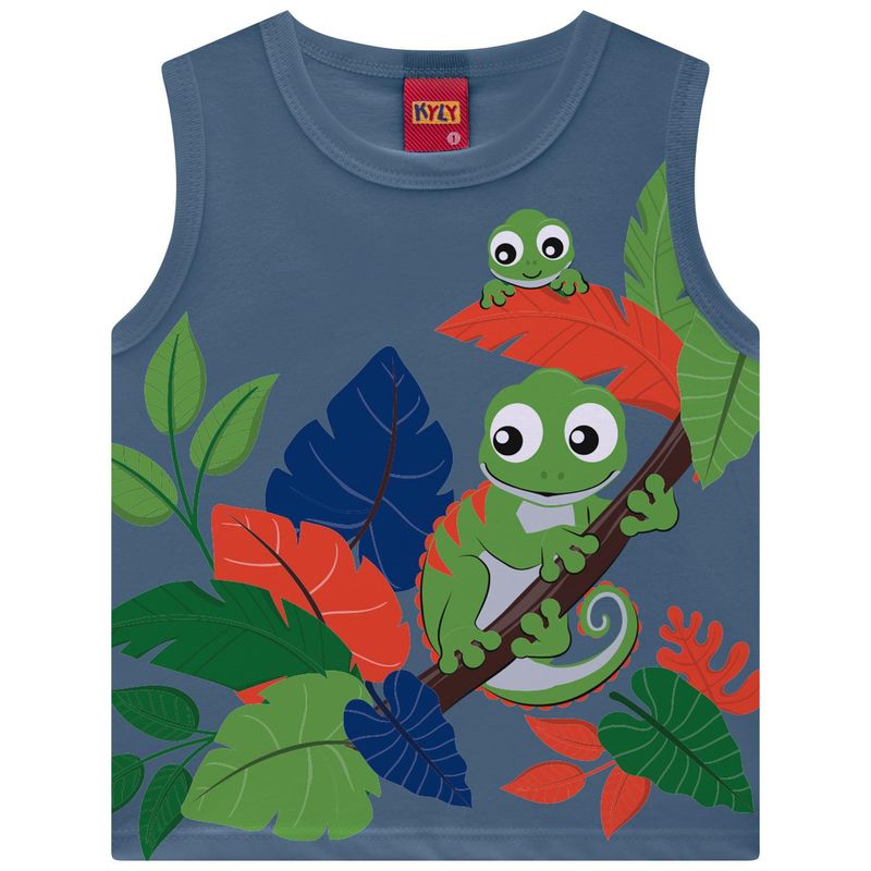 A estampa localizada dos camaleões simpáticos entre folhas coloridas traz um toque de alegria e imaginação, misturando tons vibrantes de verde, azul e laranja que remetem à natureza e às descobertas do dia a dia. Cheia de personalidade e com o DNA divertido da Kyly, essa regata é a escolha perfeita para quem ama conforto, cor e criatividade!