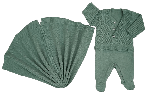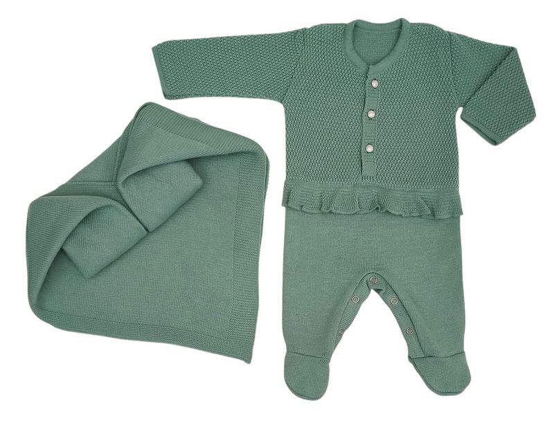 Encante-se com este lindo conjunto de tricô para bebê, composto por macacão com pezinho, casaquinho e manta combinando.