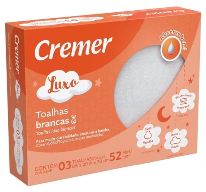 A Toalha Luxo Cremer é macia, suave e ainda proporciona alta absorção. Perfeito para ter no enxoval do seu bebê. Confeccionadas em tecido duplo de fibra 100% algodão. Ideal para o banho do bebê e para proteção durante os passeios.