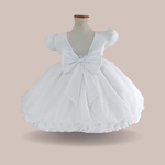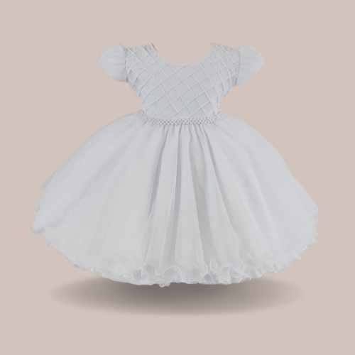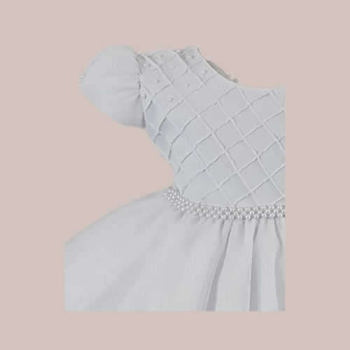 Vestido Nelu, vestido manga curta com cinto de pérolas, peito rendado e com aplicações em pérolas, costas aberta.