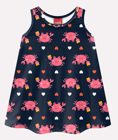 Um encanto que vem direto do mar! O vestido infantil menina Kyly é pura diversão em forma de roupa. Confeccionado em meia malha 100% algodão, o tecido é leve, macio e respirável, garantindo conforto o dia todo, perfeito para acompanhar as pequenas em suas brincadeiras ensolaradas. A modelagem soltinha e evasê oferece liberdade de movimento e um caimento gracioso, enquanto o decote redondo traz um toque delicado e confortável. A estampa rotativa com caranguejinhos sorridentes e corações coloridos é o destaque da peça, trazendo um ar alegre e divertido que combina perfeitamente com o espírito leve da infância. Um vestido cheio de cor, conforto e simpatia, perfeito para os dias de sol, passeios e muitas risadas! Marca: Kyly