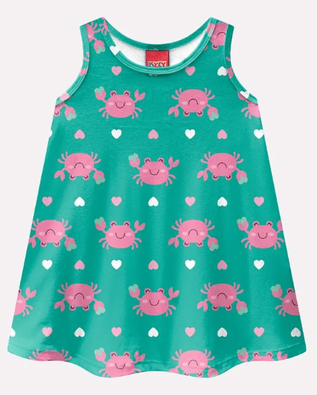 A modelagem soltinha e evasê oferece liberdade de movimento e um caimento gracioso, enquanto o decote redondo traz um toque delicado e confortável. A estampa rotativa com caranguejinhos sorridentes e corações coloridos é o destaque da peça, trazendo um ar alegre e divertido que combina perfeitamente com o espírito leve da infância. Um vestido cheio de cor, conforto e simpatia, perfeito para os dias de sol, passeios e muitas risadas!