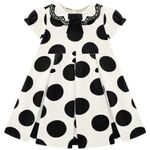 O corpo do vestido é valorizado pela clássica estampa de bolinhas póa, um ícone atemporal que nunca sai de moda. A cintura marcada com pregas garante caimento estruturado e volume suave à saia. Com design versátil e elegante, esse vestido é perfeito tanto para ocasiões especiais quanto para passeios em família, garantindo que sua pequena esteja sempre confortável e cheia de estilo. Uma peça delicada, divertida e atemporal para brilhar em todas as estações