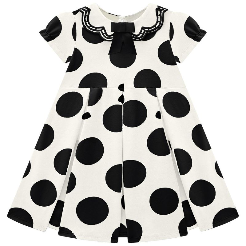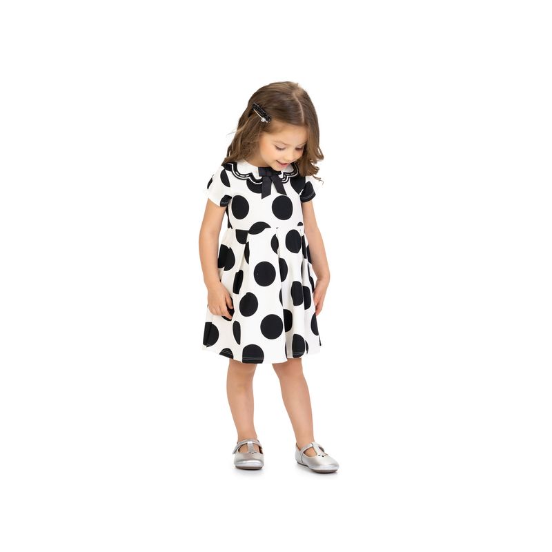 O corpo do vestido é valorizado pela clássica estampa de bolinhas póa, um ícone atemporal que nunca sai de moda. A cintura marcada com pregas garante caimento estruturado e volume suave à saia. Com design versátil e elegante, esse vestido é perfeito tanto para ocasiões especiais quanto para passeios em família, garantindo que sua pequena esteja sempre confortável e cheia de estilo. Uma peça delicada, divertida e atemporal para brilhar em todas as estações