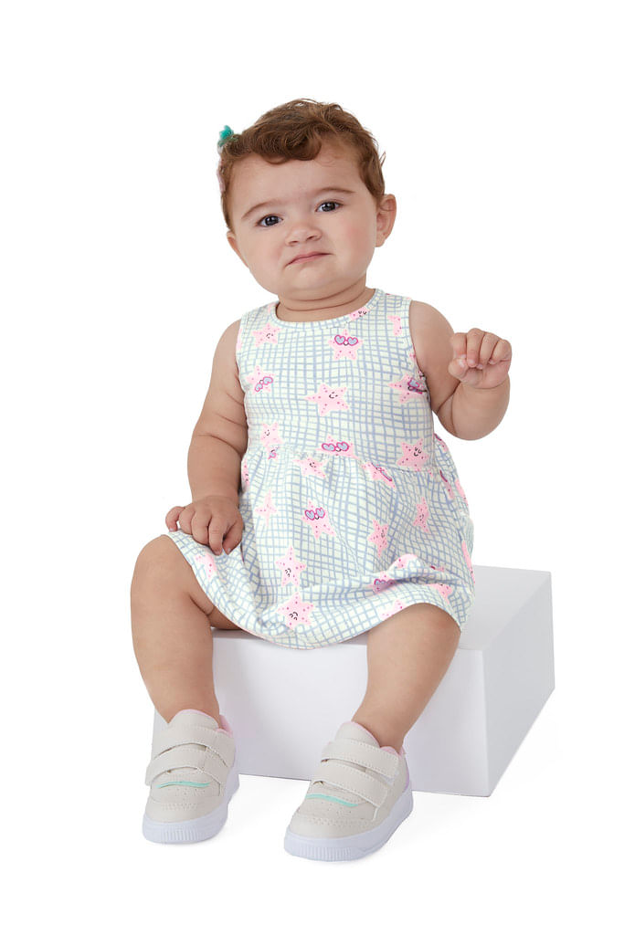 Encante com charme e conforto! Nosso vestido infantil sem mangas é ideal para bebês de 9 a 24 meses, oferecendo liberdade de movimento para os primeiros passos com muito estilo. Confeccionado em malha suave e respirável, é perfeito para dias quentes.